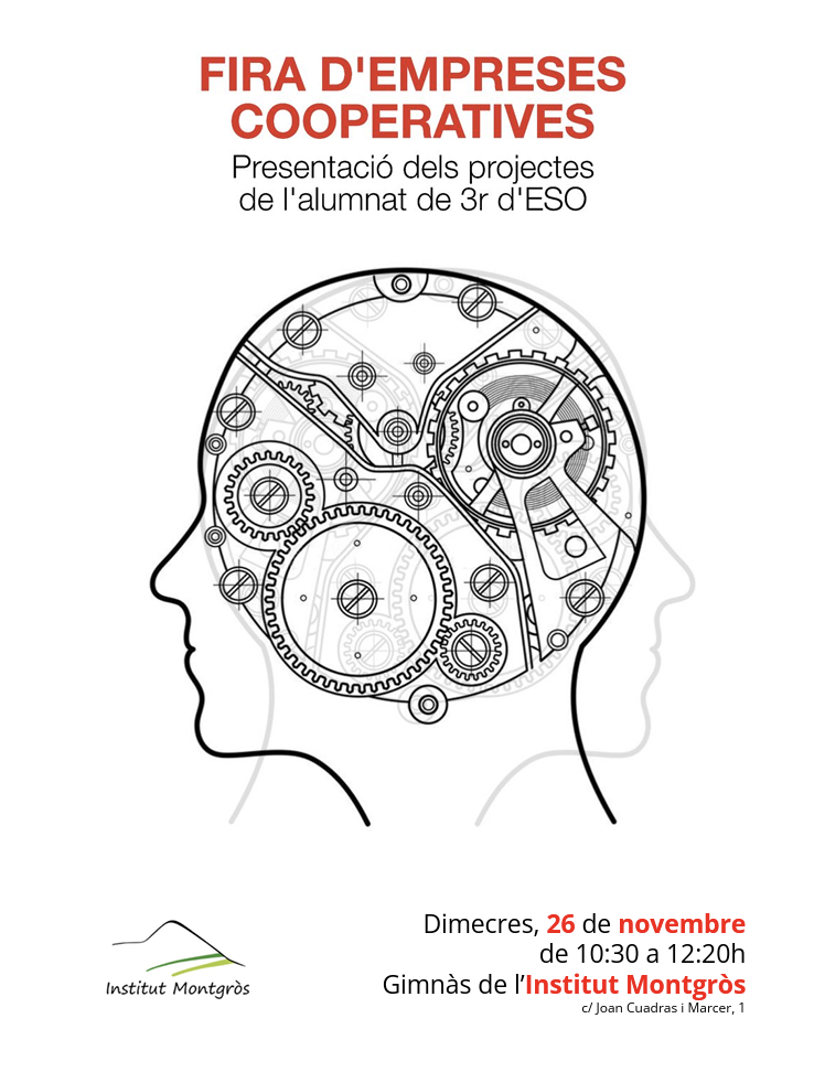 L'alumnat i professorat de 3r d'ESO us convidem a la Fira d'Empreses Cooperatives el proper dimecres 26 de novembre de 10.30h a 12.20h al gimnàs de l'institut.
